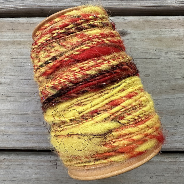 Flame Bright: I spun this singles during this year’s Tour de Fleece in July. It’s an intentionally thick-and-thin art yarn, spun from three art batts that I created last year on my blending board using red and orange merino, scraps of black and yellow wool (type unknown), and some angelina and sari silk threads. I plan to spin a thin red singles to ply it with. The yellow wool is a bit scratchy, so unless it softens with washing, this is probably destined for a bag or table runner rather than a garment. I’ll probably try weaving with it.